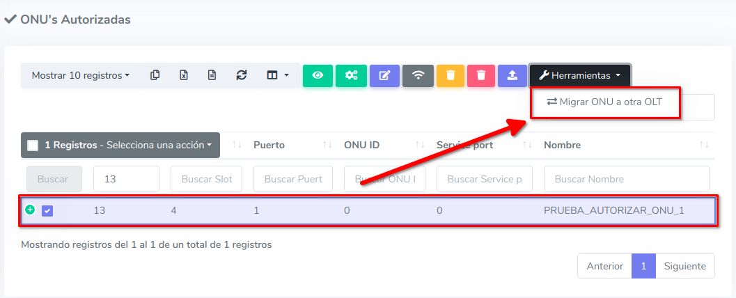 Fecha de liberacion 17 de Noviembre de 2020 a las 09:40 Opción de migrar una ONU Autorizada a otra OLTAhora se pueden Migrar ONU's a otra OLT, desde lista de ONU's de Autorizadas puede escoger la ONU que desea cambiar de OLT.