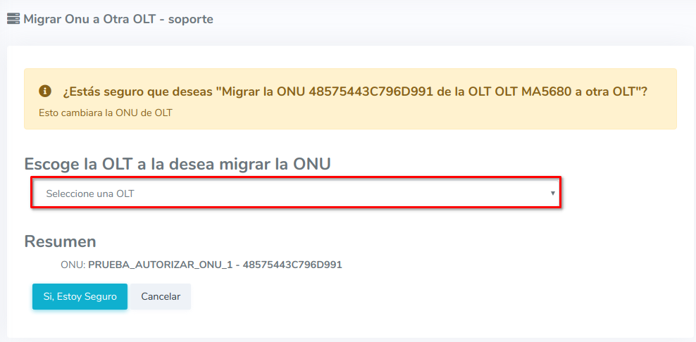 Y escoger a que OLT se quiere migrar, lo que hara AdminOLT es eliminar la ONU de la OLT y agregarla a la OLT.