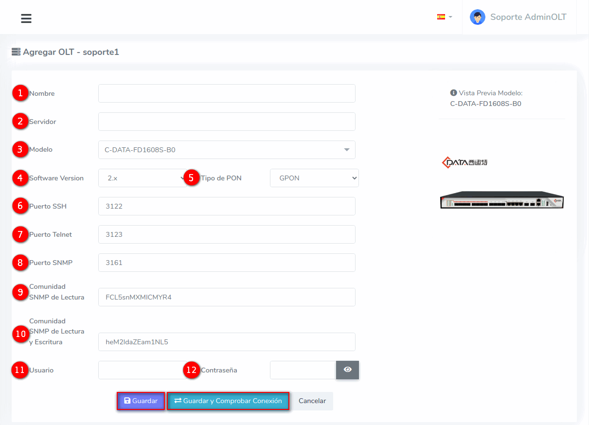 - Modelo: Modelo de la OLT a registrar.