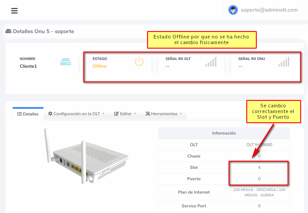 8 Cambiar ONU de Slot y Puerto fisicamente y verificar estado de la ONU
