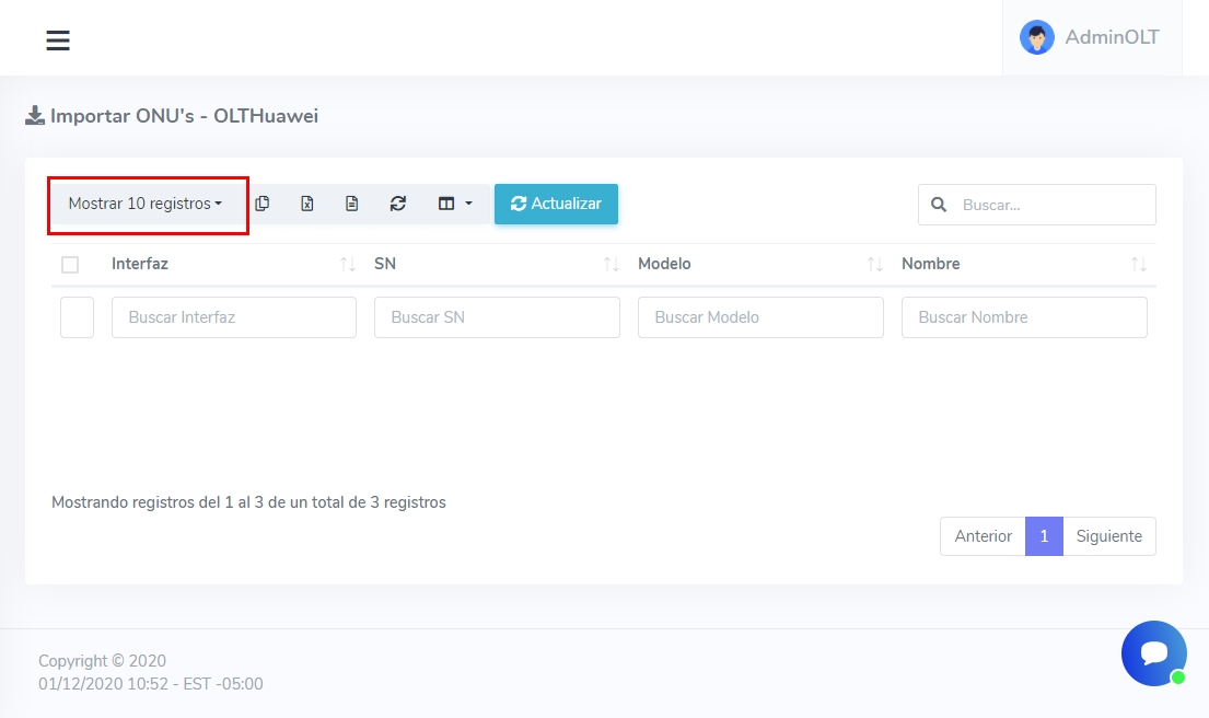 3Una vez que hayamos seleccionado los equipos que queramos cargar al sistema solo toca darle en la opción de Selecciona una acción y en Importar ONU’s a AdminOLT lo que empezara a cargar dicho equipo.