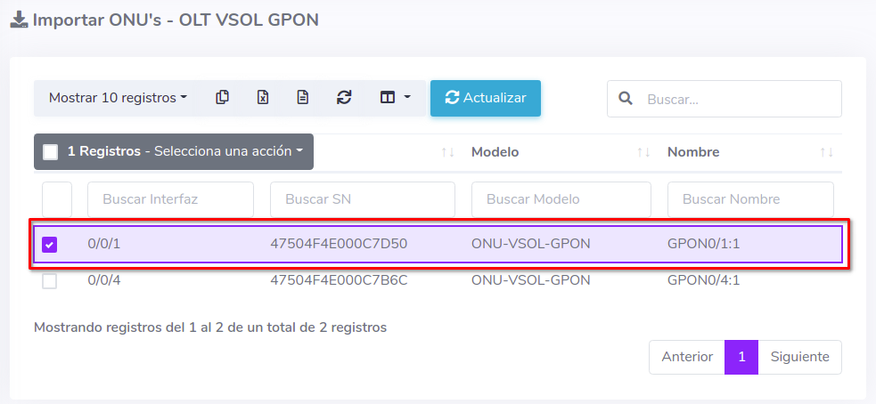 3Una vez que hayamos seleccionado los equipos, importamos las ONU's al sistema AdminOLT