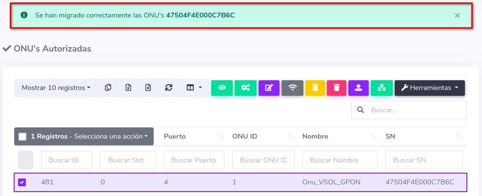 1 En ONU's > Lista de Onu's Autorizadas debemos escoger el equipo con el que se trabajará y seleccionar Migrar ONU a otra OLT que se encuentra en el botón con la leyenda Herramientas.