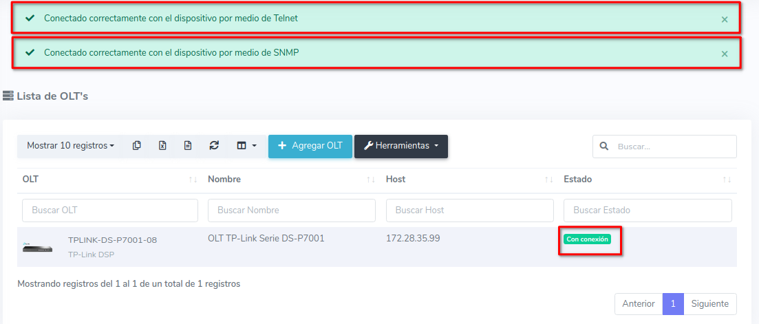 5 Verificar la conexión de su OLT en AdminOLT (en caso de que no haya conexión por SNMP es porque su OLT aún no cuenta con las configuraciones iniciales).