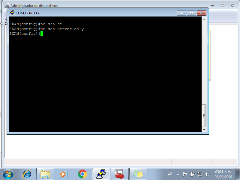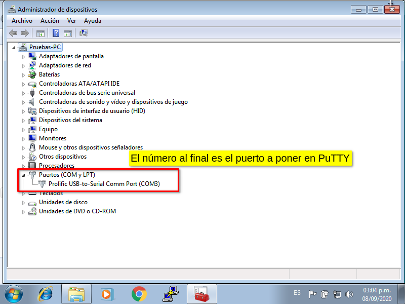 2 Debe verificar en que puerto COM se ha conectado la OLT. Para ello debe ingresar al Administrador de dispositivos de Windows y ubicar la parte de Puertos (COM Y LPT). Ahi se mostrará en que puerto se ha asignado. Para este ejemplo, fue en el puerto COM3