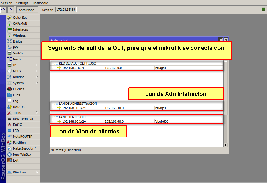 2 Debemos tener agregadas nuestro Vlan, LAN de Administración y LAN de Segmento de Clientes. Para más información puede leer el manual Configuración en RouterBoard MikroTik para OLT Hioso EPON