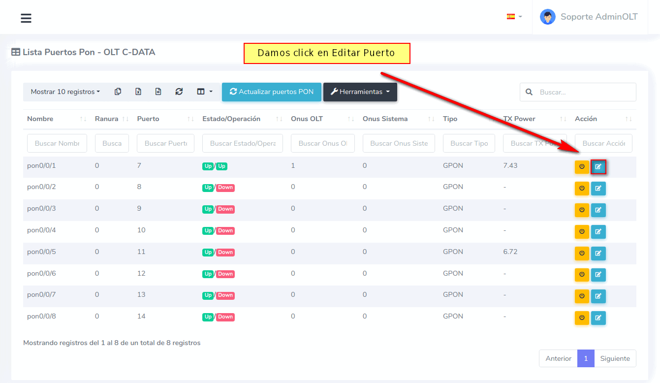 1 Ir a Lista de Puertos PON de nuestra OLT