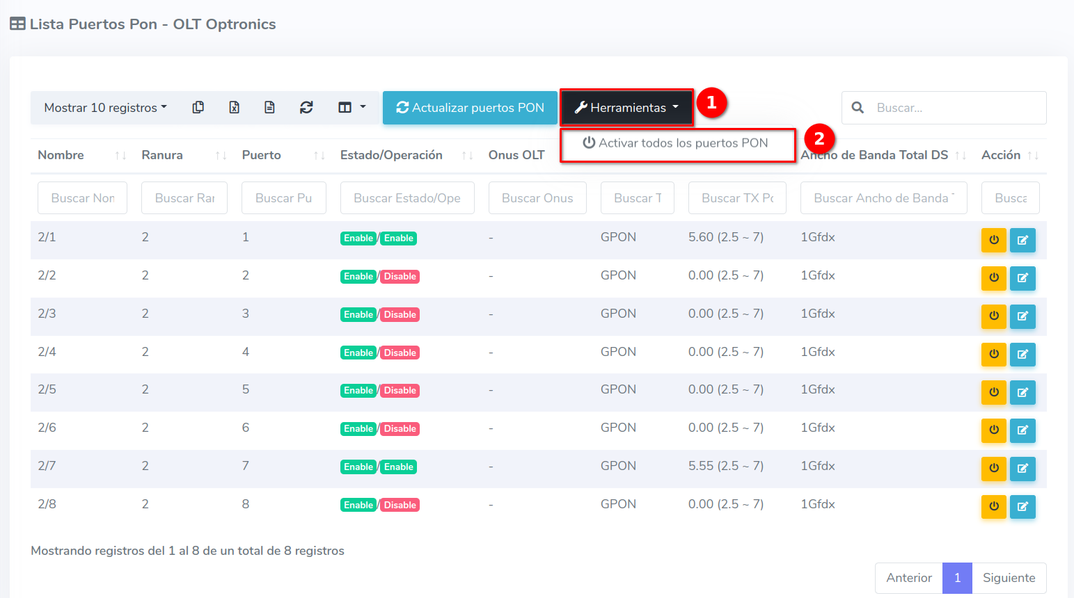 1 Ir a Lista de Puertos PON de nuestra OLT