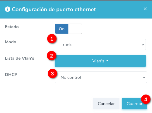 Coloque la opción modo en Trunk, seleccione las vlan's en la opcion Lista de Vlan's, seleccione el tipo de DHCP y guarde el cambio