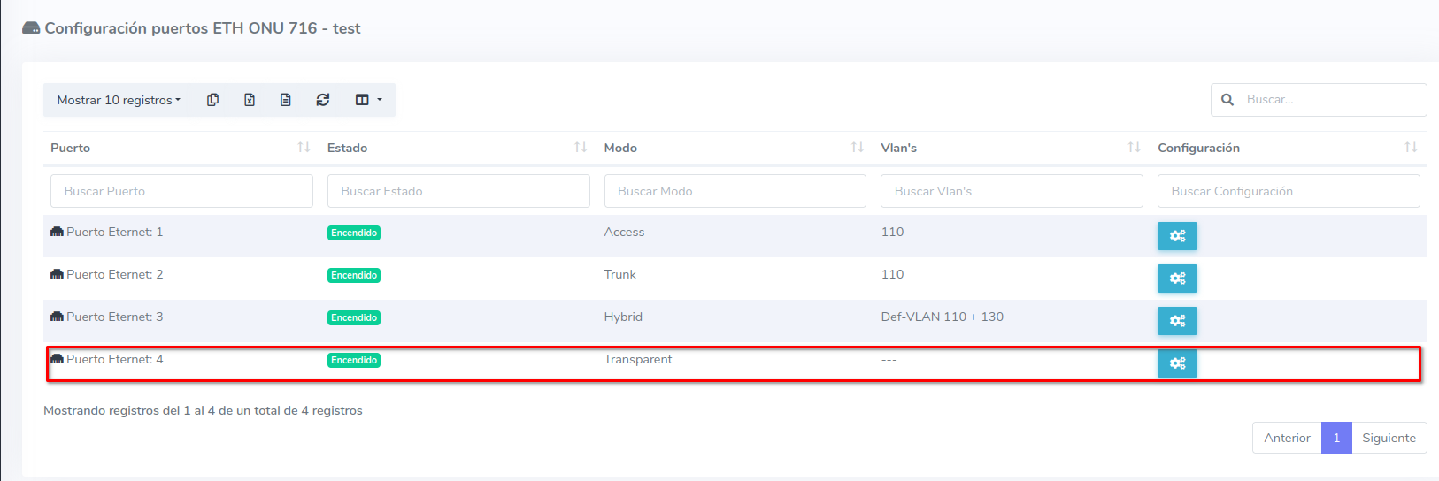 AdminOLT ha integrado una característica para hacer configuraciones de los puertos ETH. Pudiendo mandar vlans en diferentes modalidades que son Trunk, Hybrid, Access y Transparent, y asi poder colocarlas en cada uno de estos modos y que puedan ser mandadas de manera especifica sobre los puertos ETH.