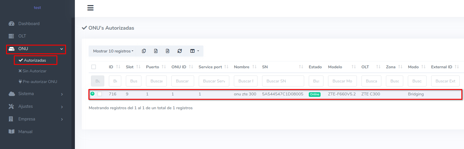 1Dirijase a la sección de ONU > Autorizadas y seleccione la ONU con la que desea trabajar.
