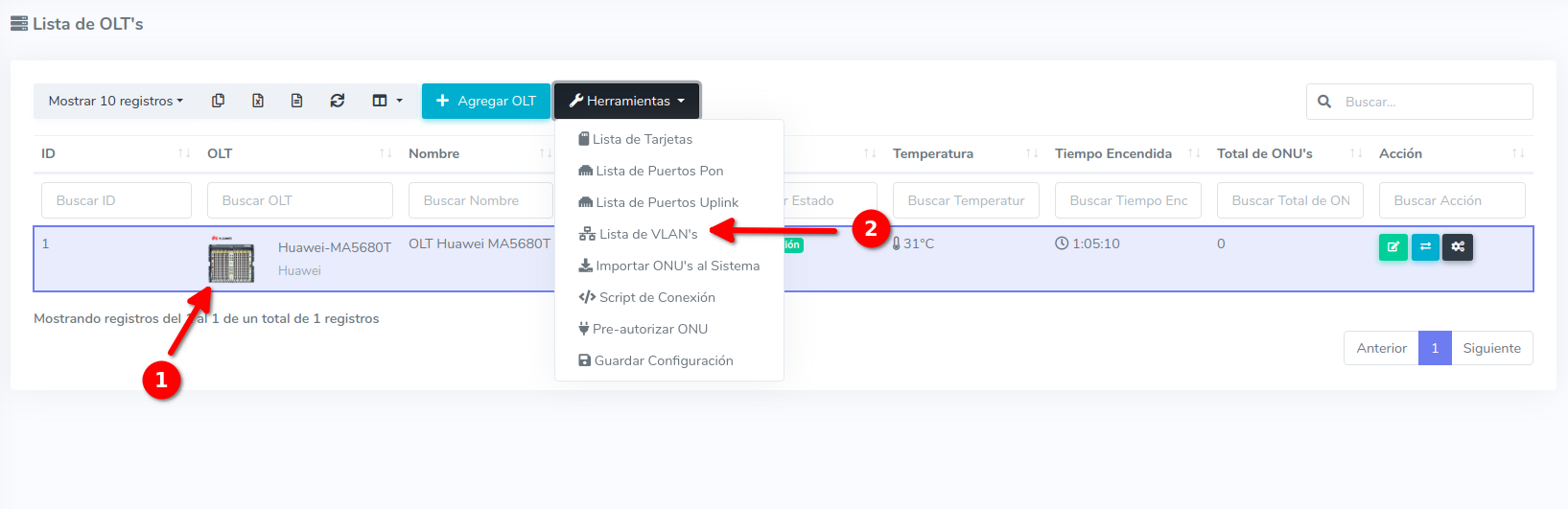 1Teniendo una VLAN en tu router, podremos asignarla en la OLT desde la lista de OLT's seleccionando la OLT ya la opcion lista de VLAN's.