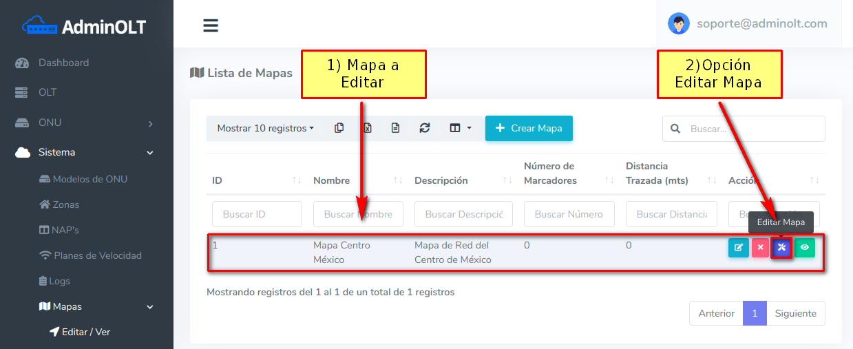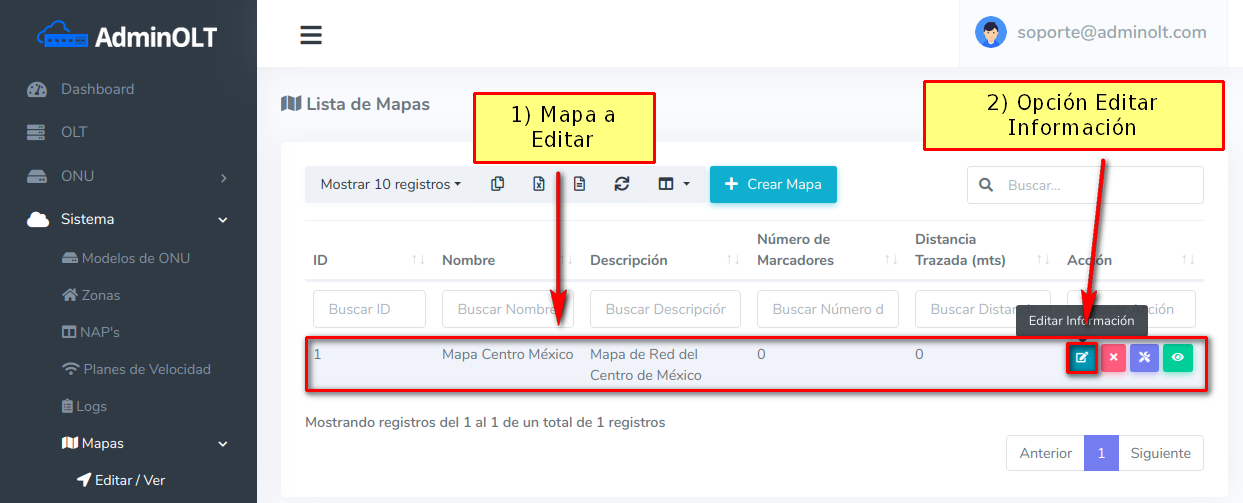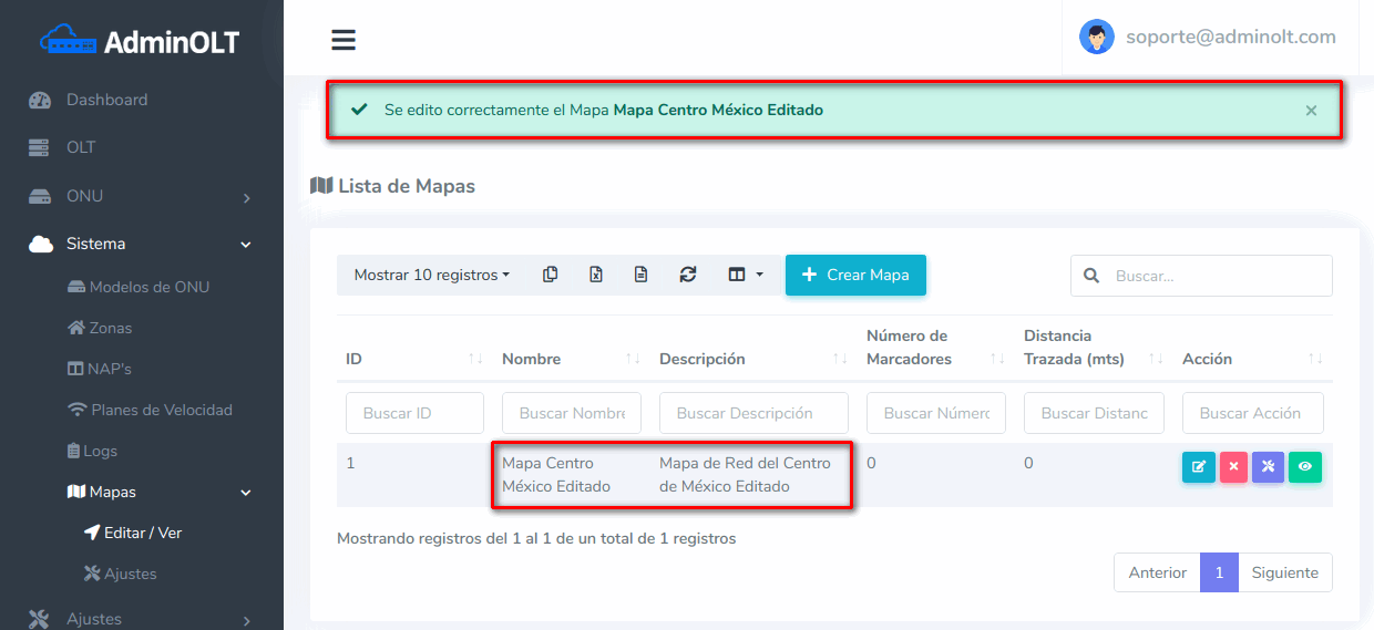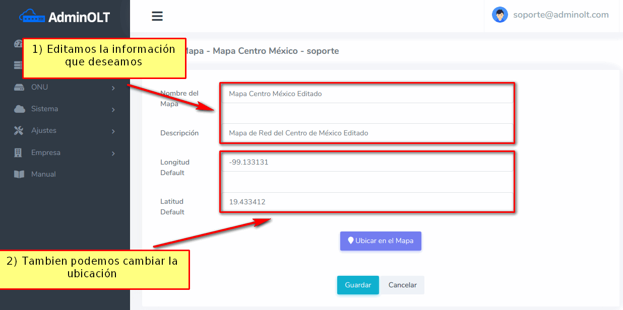 Como se ha mencionado antes, en AdminOLT se puede editar la información de un mapa, esto conlleva a solo modificar el nombre, descripción y ubicación de este, para poder hacer esto debemos seguir los siguientes pasos.