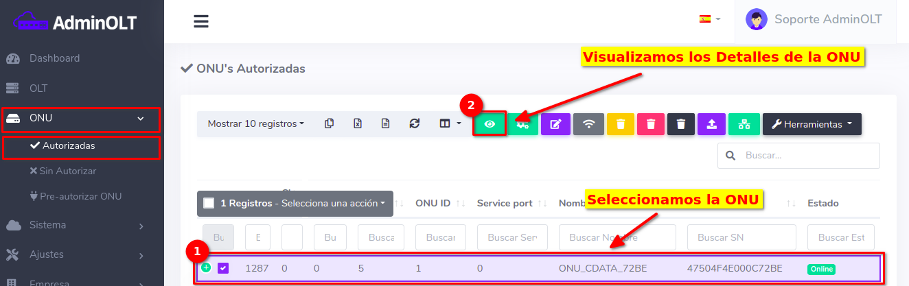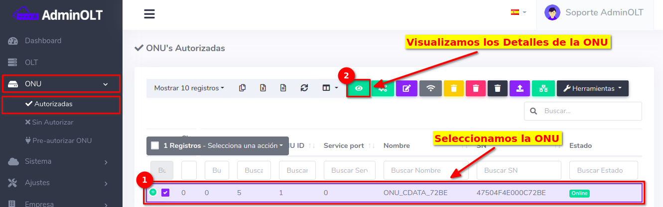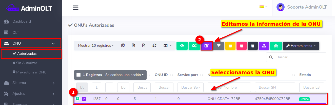 Pasos para editar información de ONU Autorizada en AdminOLT