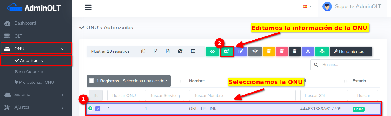 Pasos para editar información de ONU Autorizada en AdminOLT
