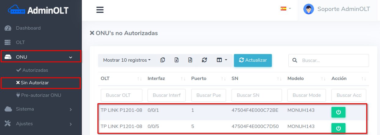 Pasos para editar información de ONU Autorizada por SN