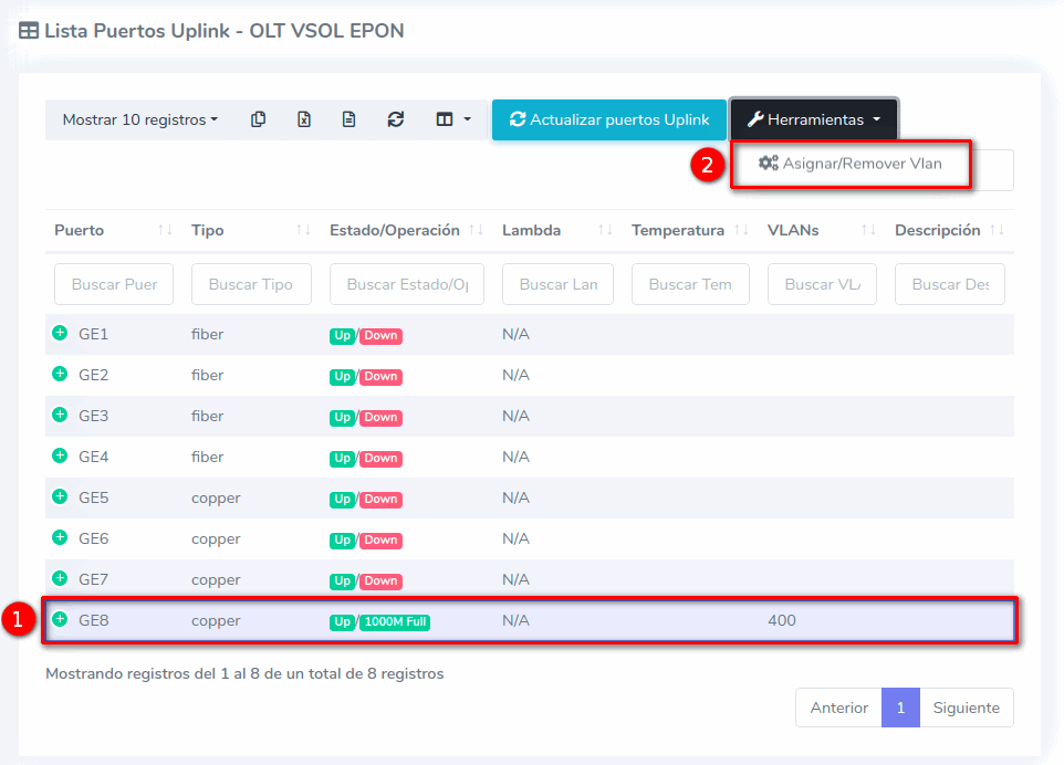 1En la Lista OLT's seleccionamos el equipo con el que trabajaremos para después ir a Puertos Uplink, que se encuentra en el botón con la leyenda Herramientas.