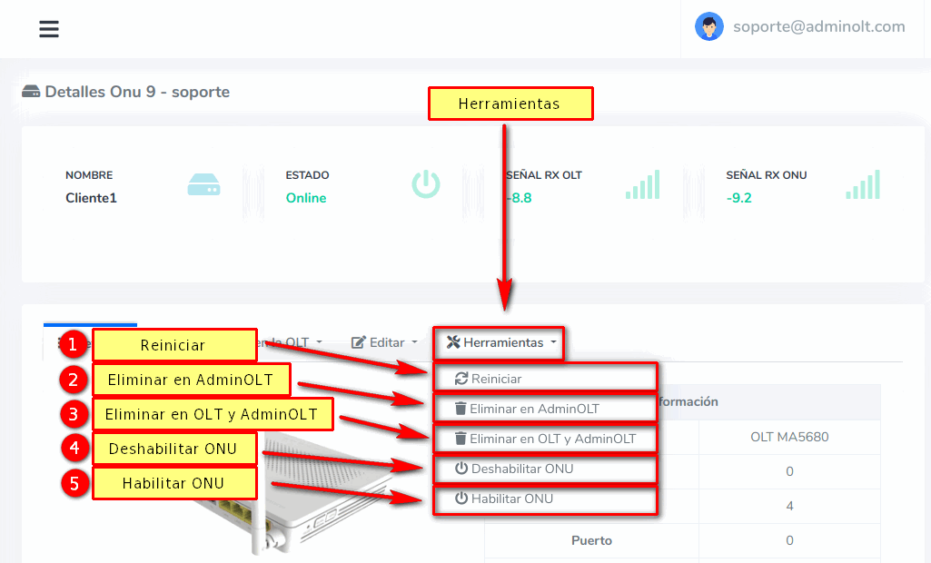 3.- Eliminar en OLT y AdminOLT: Para más información puede leer el apartado Eliminar ONU de AdminOLT y OLT desde Detalles de la ONU